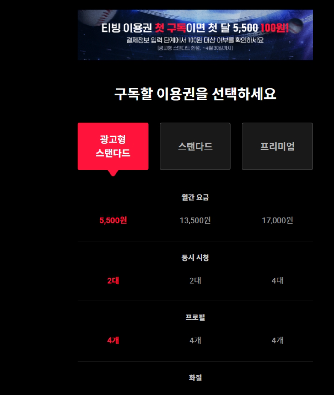제일 저렴한 광고형 스탠더드형을 선택하면 월 5500원에 동시 시청 2대까지 가능한데요. 4.30일까지는 티빙 이용권 첫 구독이면 첫 달 100원에 시청할 수 있는 이벤트를 진행 중이니 구독 경험이 없는 분들은 좋은 기회가 될 것 같아요.